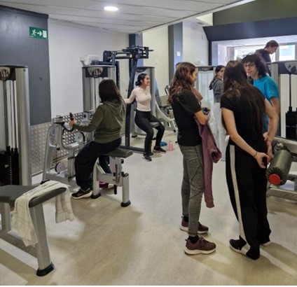 Durante la visita al Gimnasio Gramontagne los alumnos divididos en dos grupos, aprendieron a manejar el equipamiento de peso muerto y las máquinas con poleas, así como a manejar parámetros de volumen e intensidad para los entrenamientos y a posteriori durante la siguiente hora, pudieron poner en práctica actividades dirigidas como: spinning, bodycombat y bodypump.